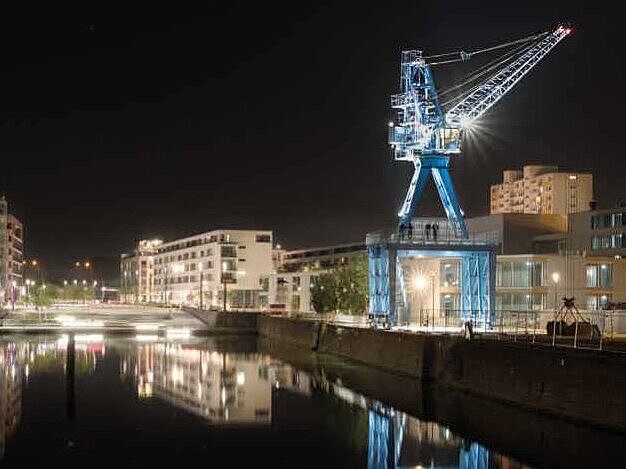 Das Herzstück im Osten bildet der 5.500 Quadratmeter große Gutschepark. Benannt nach dem visionären Gartenbaudirektor Oskar Gutsche, bietet er mit seinem 2018 eingeweihten Spielplatz Raum für alle Generationen. Direkt am Eingang ragt das Wahrzeichen des Viertels empor: Der Blaue Kran. Das Künstlerteam Winter/Hoerbelt hat das 26 Meter hohe Industrierelikt in ein begehbares Kunstwerk mit Aussichtsplattform verwandelt, das abends illuminiert über dem Hafen wacht.