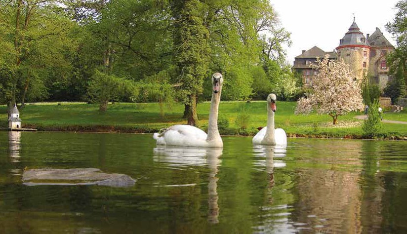 Der angrenzende Schlosspark ist ein wahres botanisches „Schatzkästchen“. Einst als französischer Renaissancegarten angelegt, verwandelte Graf Hermann Maximilian zu Solms-Laubach das Areal 1870 in einen englischen Landschaftsgarten. Wo früher Verteidigungsteiche und Landwirtschaft das Bild prägten, faszinieren heute botanische Raritäten wie ein monumentaler Mammutbaum.