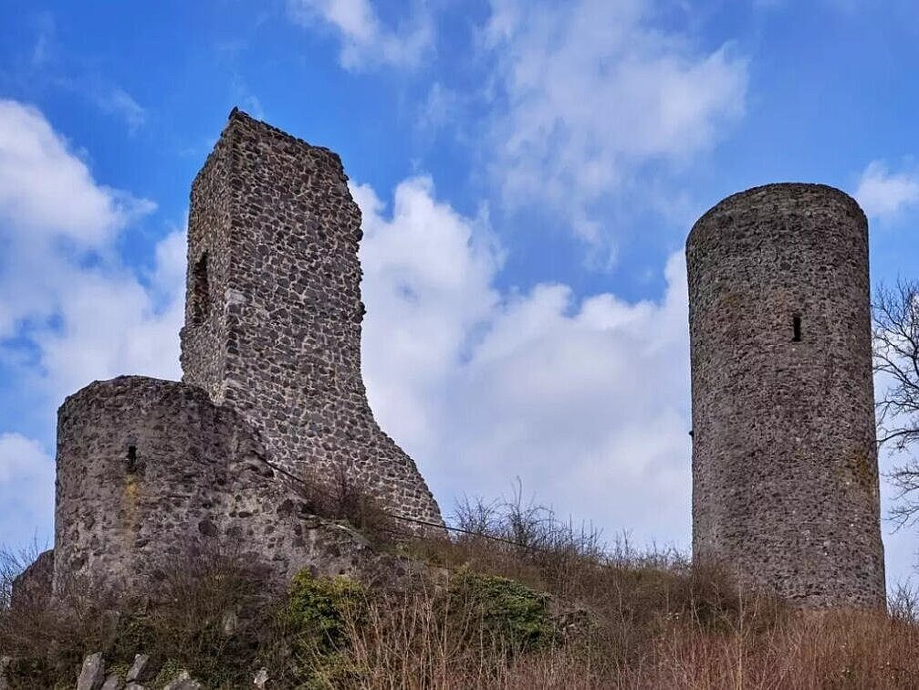 The ruins of Merenberg Castle, perched atop a striking basalt cone, are the town's landmark. It was the ancestral seat of the medieval noble family of Merenberg, who gained influence in European noble houses through clever marriages. The first documented mention of a “Hartrudus de Marinberg” dates back to 1129; his descendant Hartrad VI secured the succession of his daughters in 1326, thus initiating the transition of power to the Nassau-Weilburg line, from which the Grand Dukes of Luxembourg emerged in the 19th century. The castle, strategically located on the old Frankfurt–Siegen–Cologne trade route, provided protection, tolls, and a base for the family's rise to power. Destroyed in 1646 during the Thirty Years' War, it remained in ruins. Parts of the outer walls, cellars, the three-story palace, and the 22-meter-high round keep have been preserved. Today, the keep serves as a lookout tower offering a sweeping view of the Lahn Valley as far as the Feldberg. A plateau marks the presumed location of the outer bailey and outer ward.