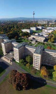 Das heute denkmalgeschützte Areal mit seinem 14 Hektar großen Park blickt auf eine bewegte Geschichte zurück – bekannt unter Namen wie IG Farben-Komplex, Abrams Building oder schlicht Poelzig-Bau. Zwischen 1927 und 1931 auf dem ehemaligen Grund der Familie Rothschild errichtet, diente es einst als Zentrale des weltweit viertgrößten Industriekonzerns. Der Architekt Hans Poelzig schuf das monumentale Gebäude, während Gartenbaudirektor Max Bromme und der renommierte „Bornimer Kreis“ um Karl Foerster die Parkanlage entwarfen.