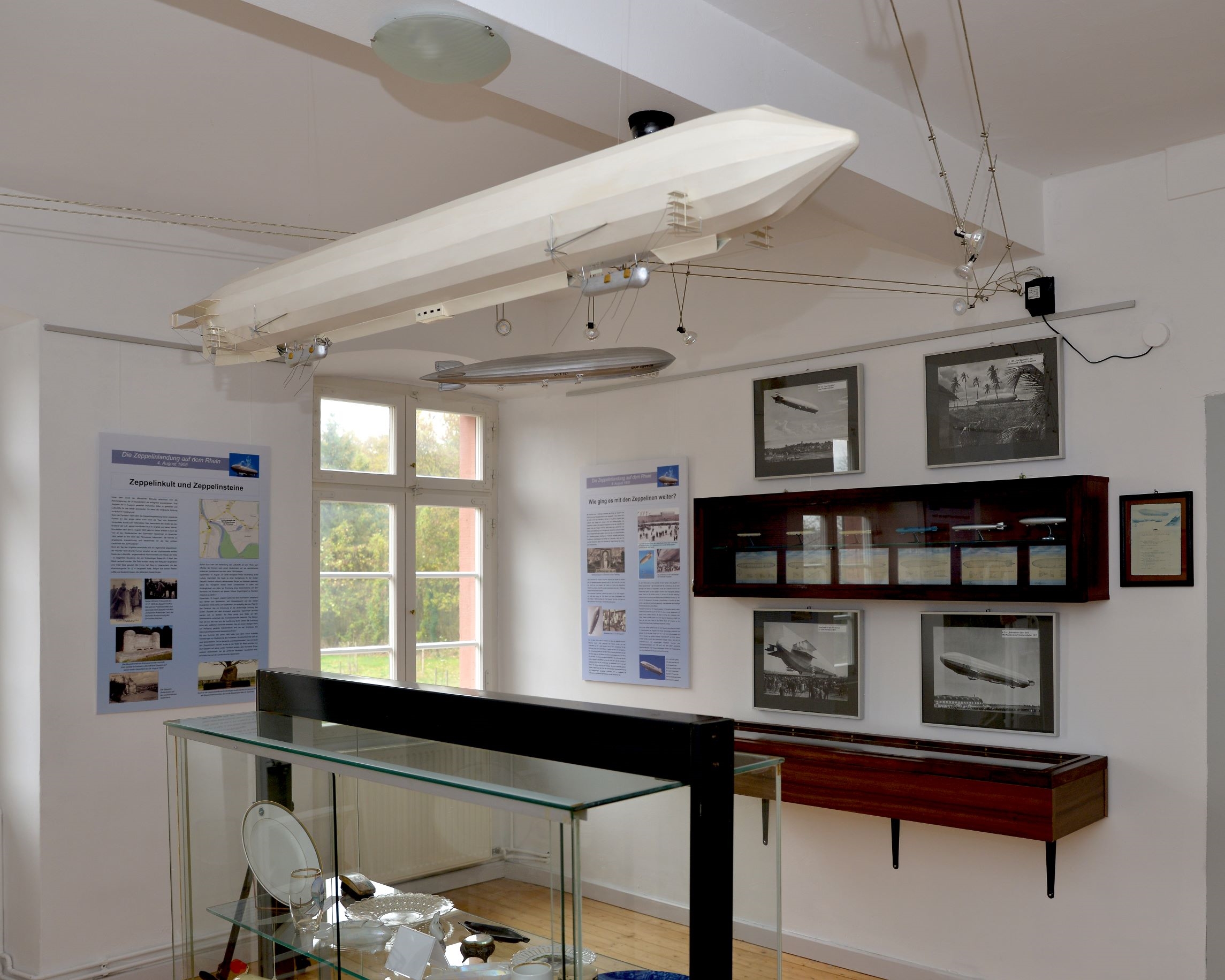 Ausstellungen zu Themenbereichen aus der Region und dem Kühkopf. Neben wechselnden Kunstausstellungen wird eine Dauerausstellung zur Geschichte des Hofgutes gezeigt, in der beispielsweise auch der Besuch des Zaren Nikolaus II von Russland auf dem Kühkopf im Jahre 1903 behandelt wird. Ein Modell des früheren Herrenhauses des Gutes und ein Modell der Wirtschaftsgebäude ergänzen die Ausstellung. Anhand des Nachbaus einer Goldwaschbank wird veranschaulicht, wie man früher im Rhein Gold wusch. Über die Themenbereiche Erdölförderung im hessischen Ried und Korbflechterei kann man sich ebenfalls informieren. In einem gesonderten Raum werden ausführlich die Hintergründe und Geschehnisse zur Notlandung des Grafen Zeppelin mit seinem Luftschiff LZ 4 auf dem Rhein veranschaulicht. Nach Vereinbarung besteht im Rahmen von Sonderführungen auch die Möglichkeit sich speziell zur Ortsgeschichte von Stockstadt am Rhein zu informieren.